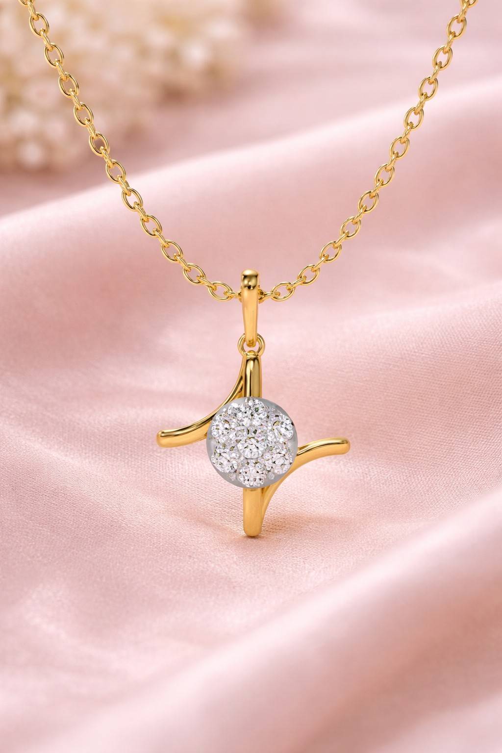 Suspended from a polished gold chain, this necklace balances minimalism with refined sparkle, making it ideal for both everyday wear and sophisticated occasions. The circular diamond cluster symbolizes unity and brilliance, while the abstract gold form adds a distinctive, modern touch.