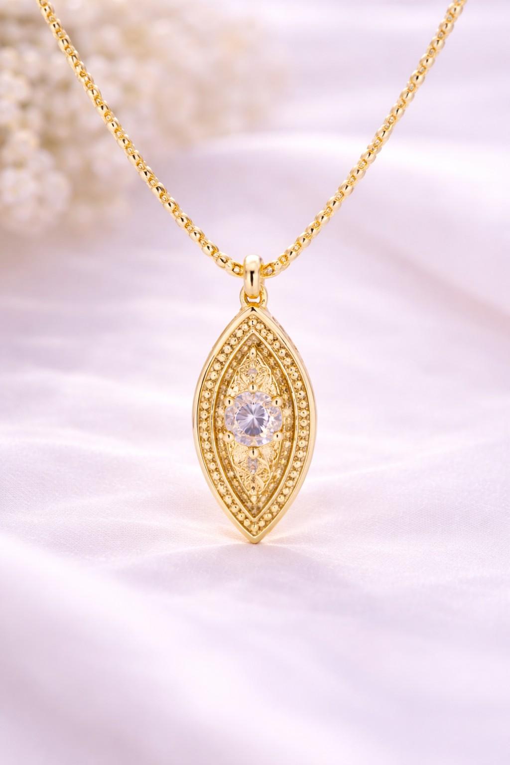 The Marisel Marquise Golden Necklace 14K is a refined expression of artistry and elegance. Featuring a beautifully sculpted marquise-shaped pendant, this necklace showcases intricate filigree detailing that reflects exceptional craftsmanship and timeless design.