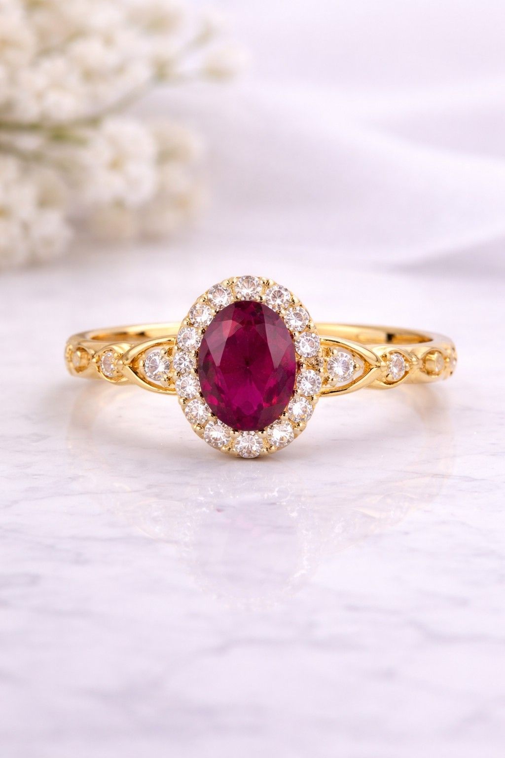Discover the Roselle Ruby Halo Golden Ring at Selora Jewellry — where every piece carries a precious story.