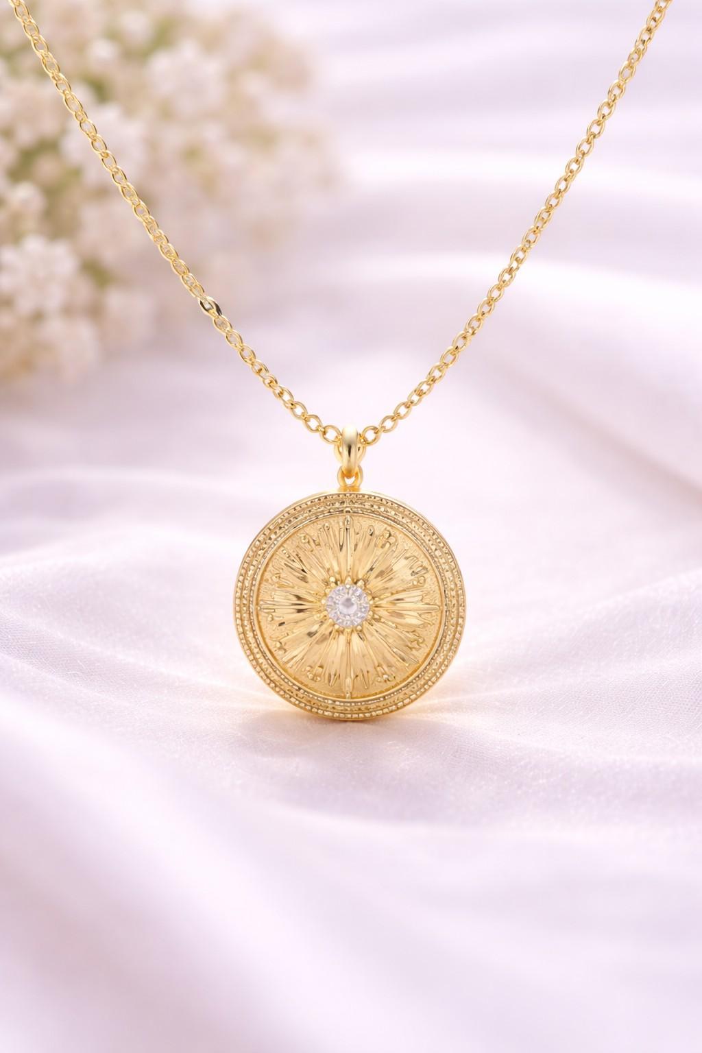 The Solara Sunburst Golden Necklace 14K is a radiant expression of elegance and timeless design. Featuring a beautifully detailed round medallion with a sunburst motif, this necklace symbolizes light, strength, and everlasting beauty.